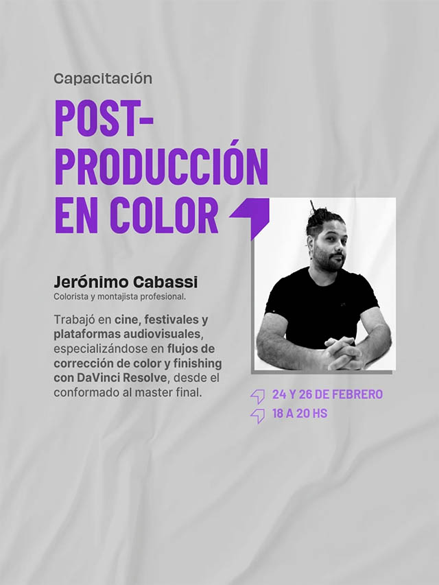 El cronograma comenzará el 23 de febrero con charlas sobre el proceso creativo desde el color y el sonido. Los talleres prácticos de postproducción en color se desarrollarán los días 24 y 26 de febrero, mientras que los de postproducción de sonido tendrán lugar el 25 y 27 de febrero, todos en modalidad virtual.
